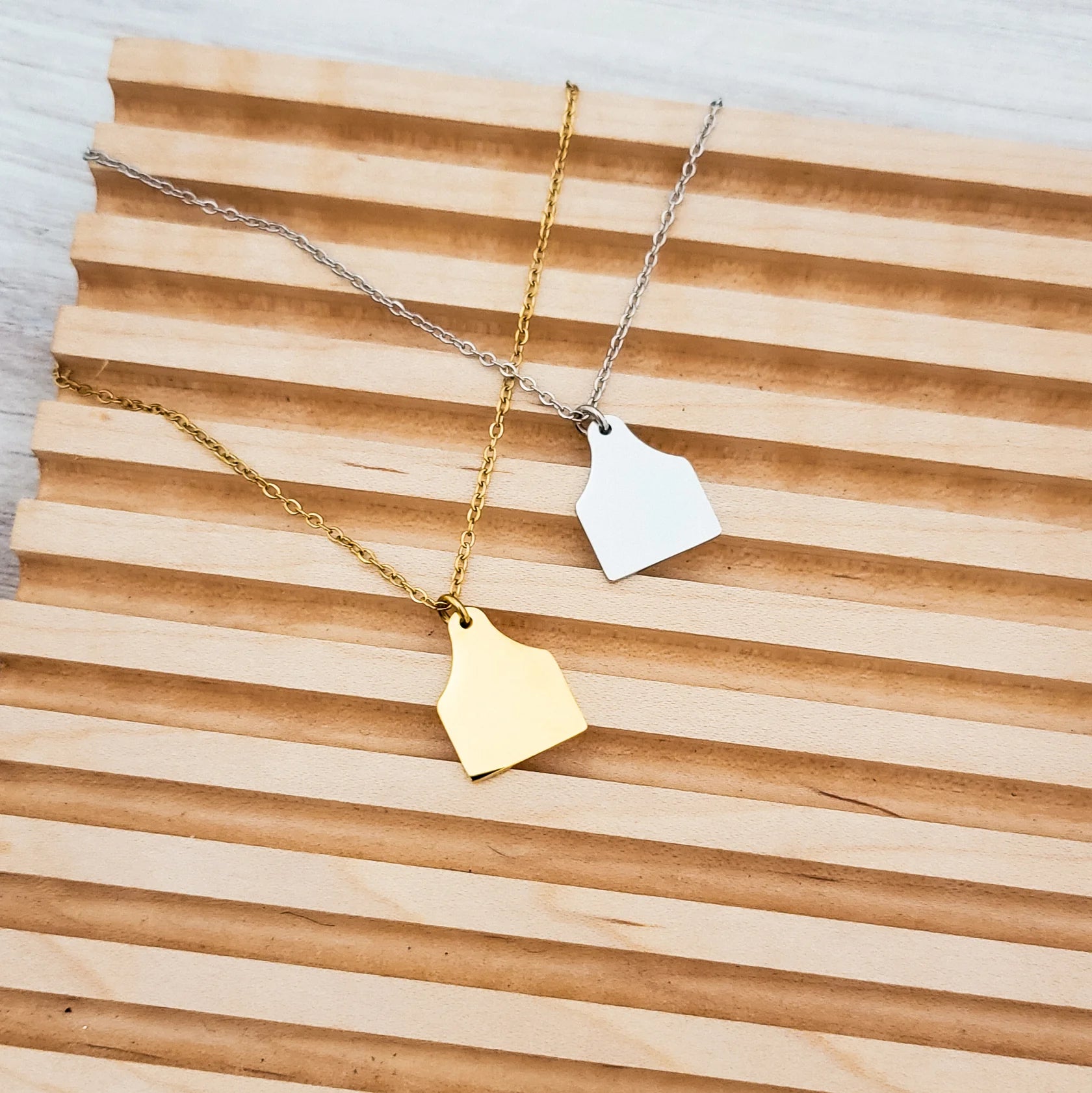 **These are a photoshop mockup of a real necklace with fake engraved text. The text color will slightly vary. It changes from a metal color like pictured to a darker/lighter engraving depending on the light**