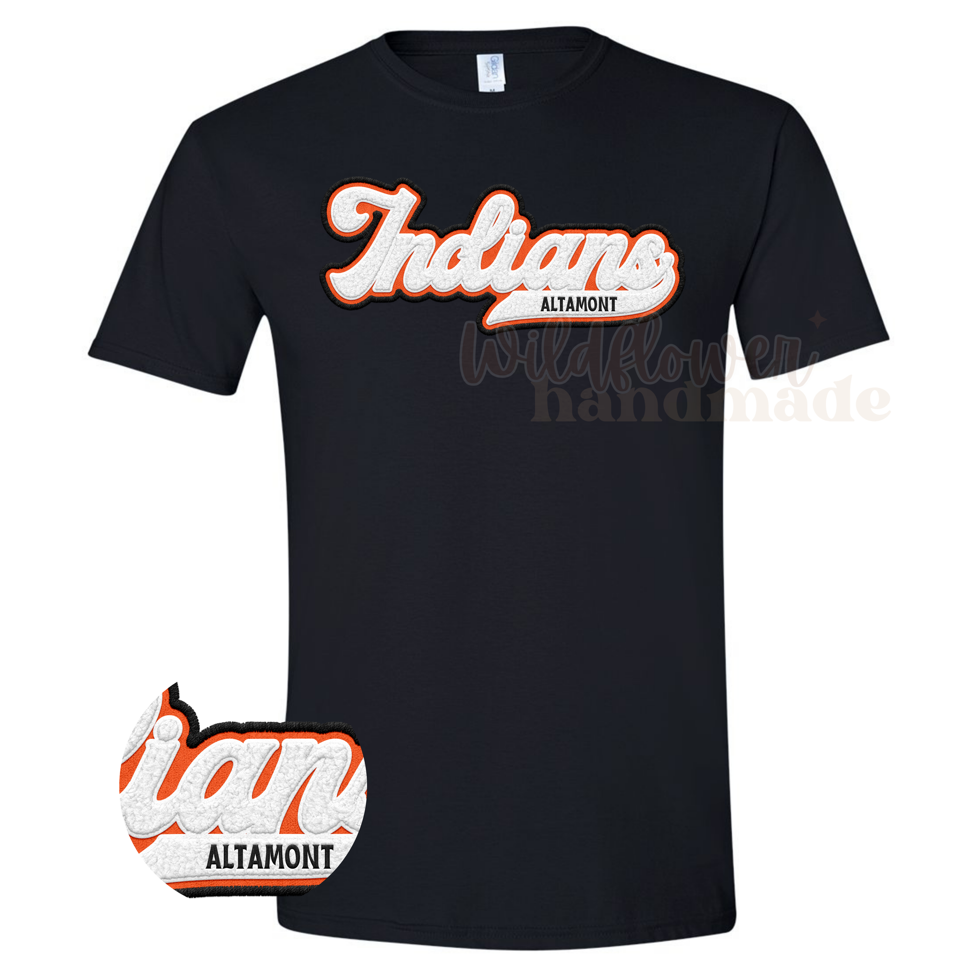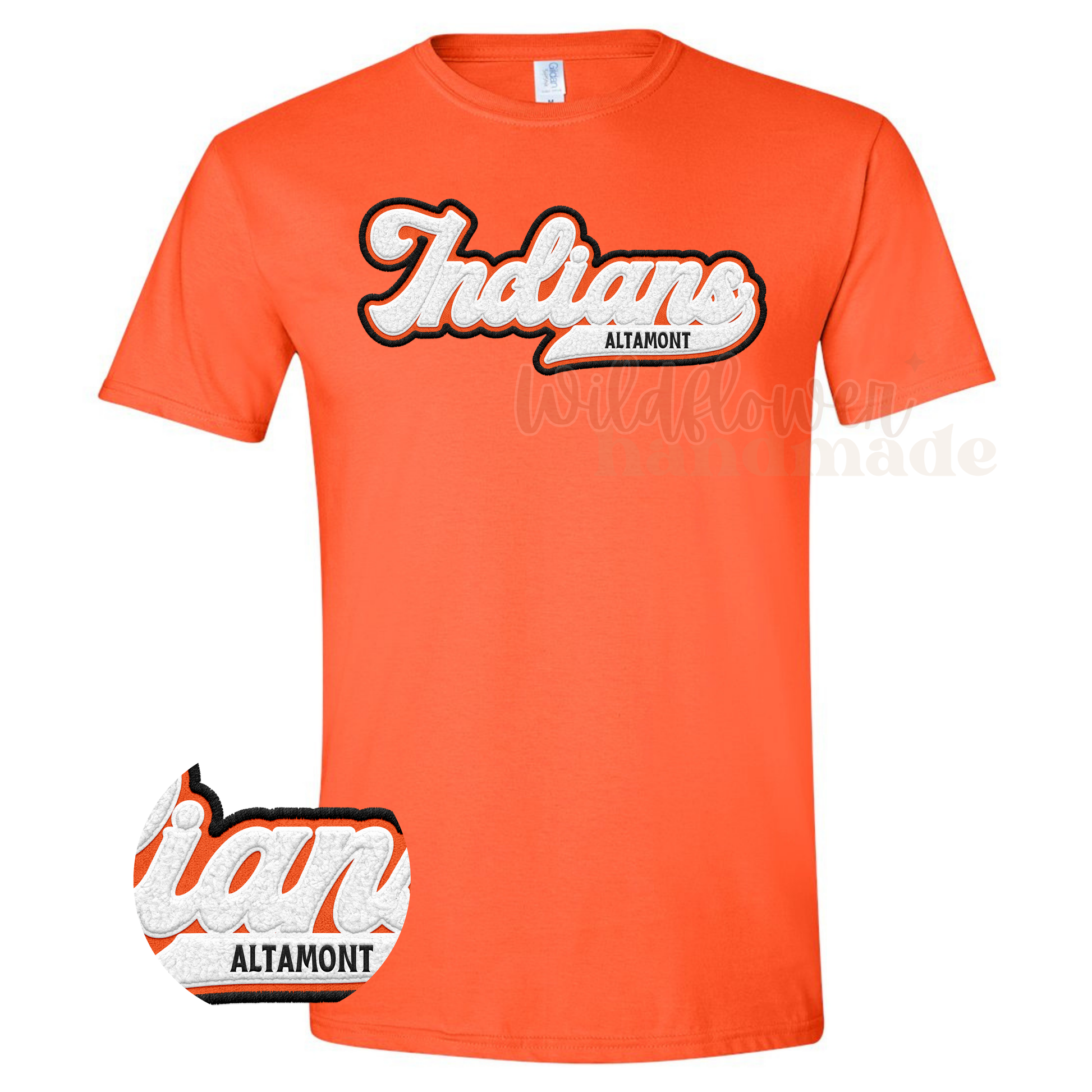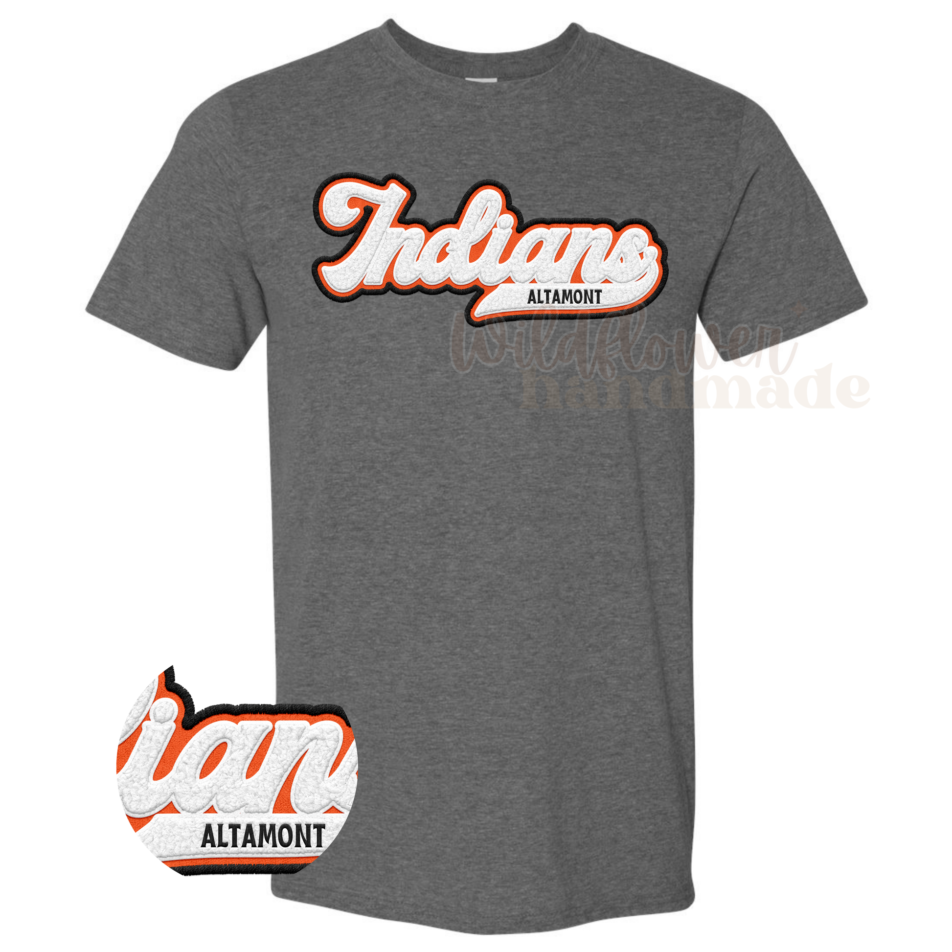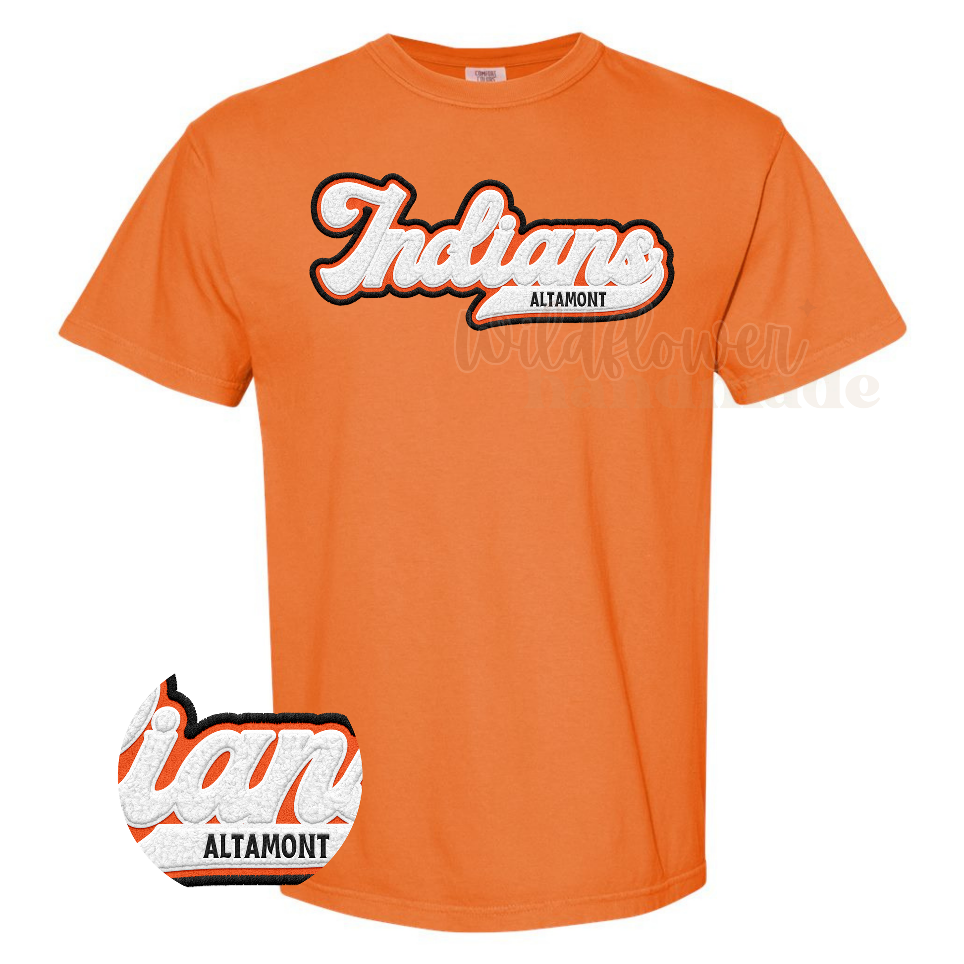 Available in orange, black or grey - *Please note: design is FAUX chenille and is screen printed flat against the shirt*