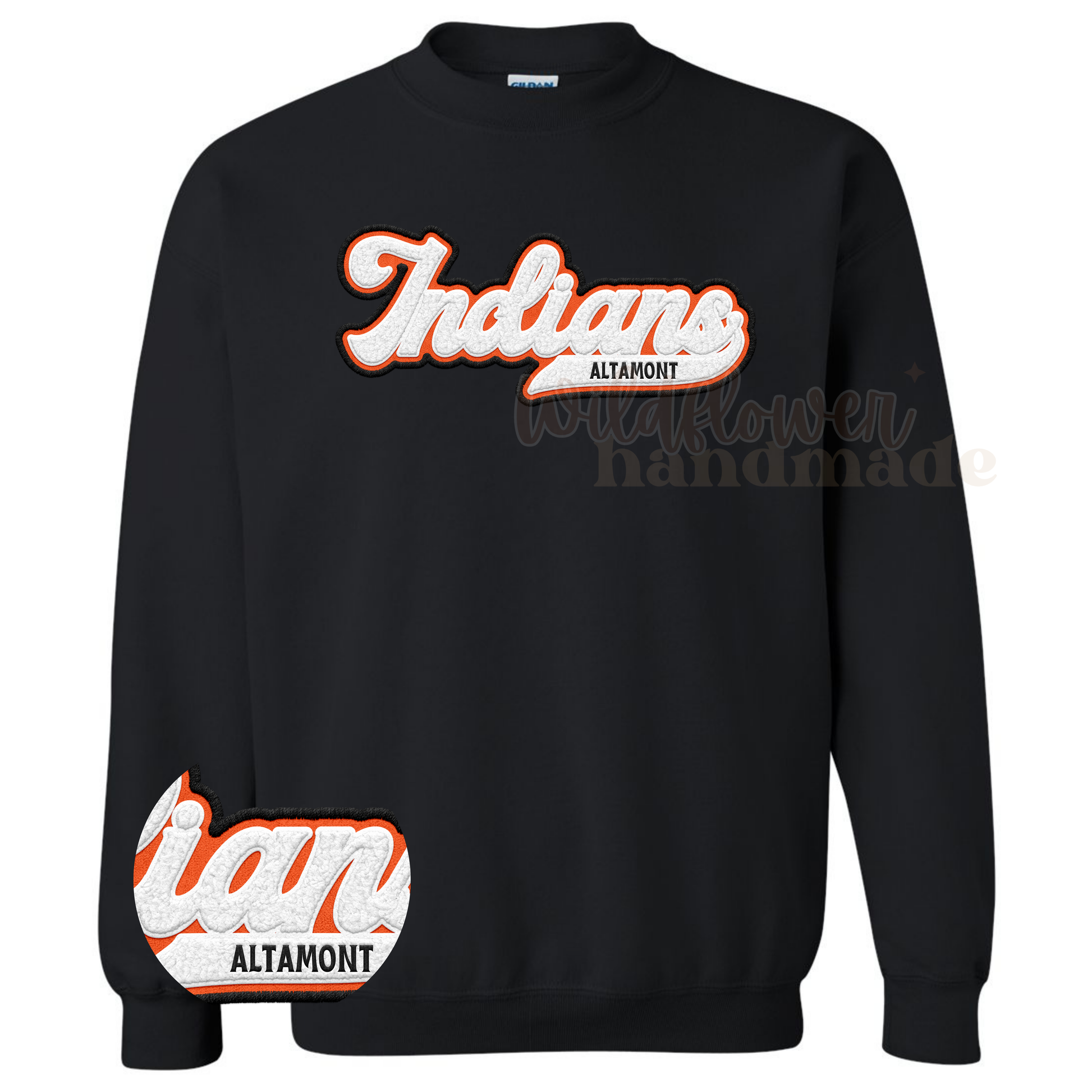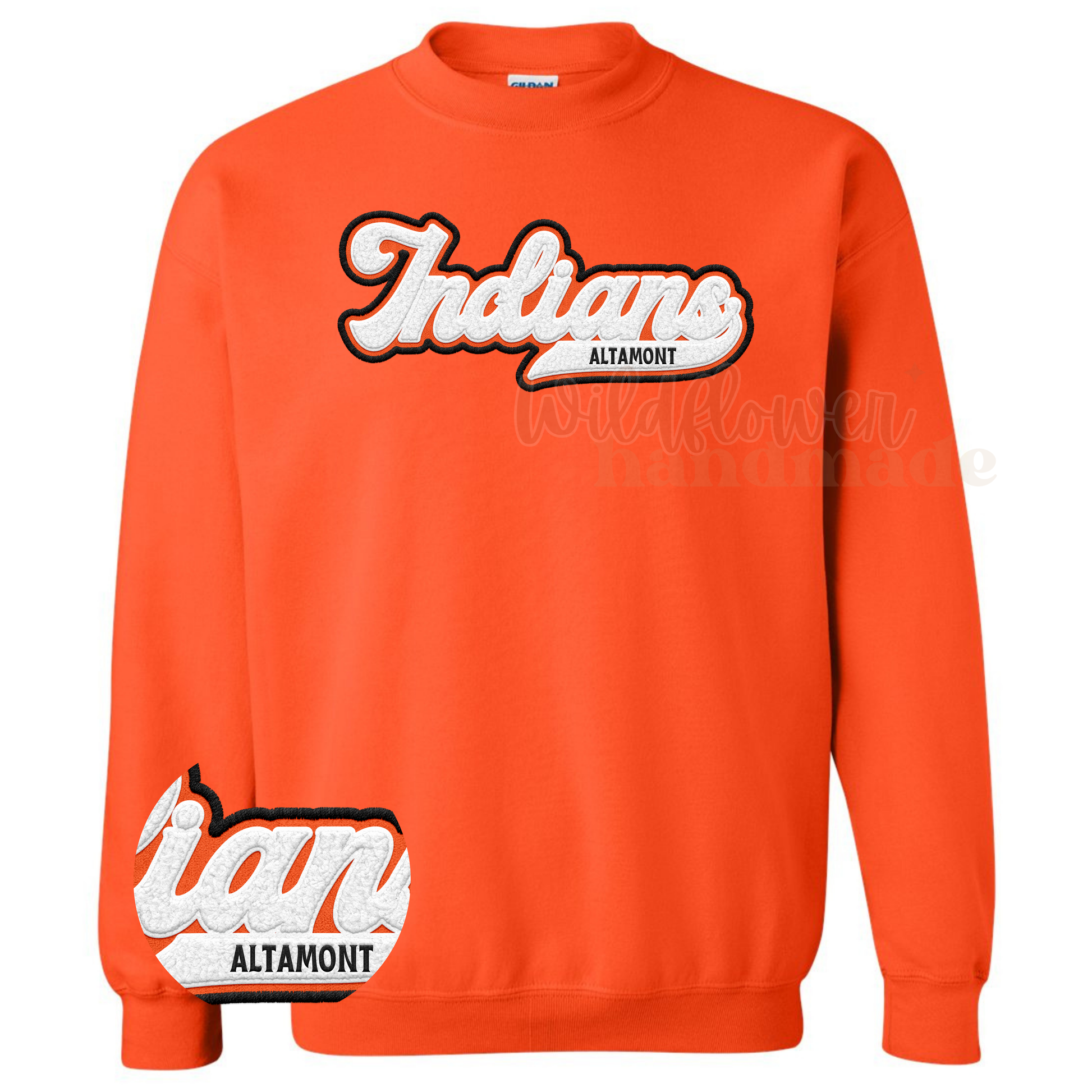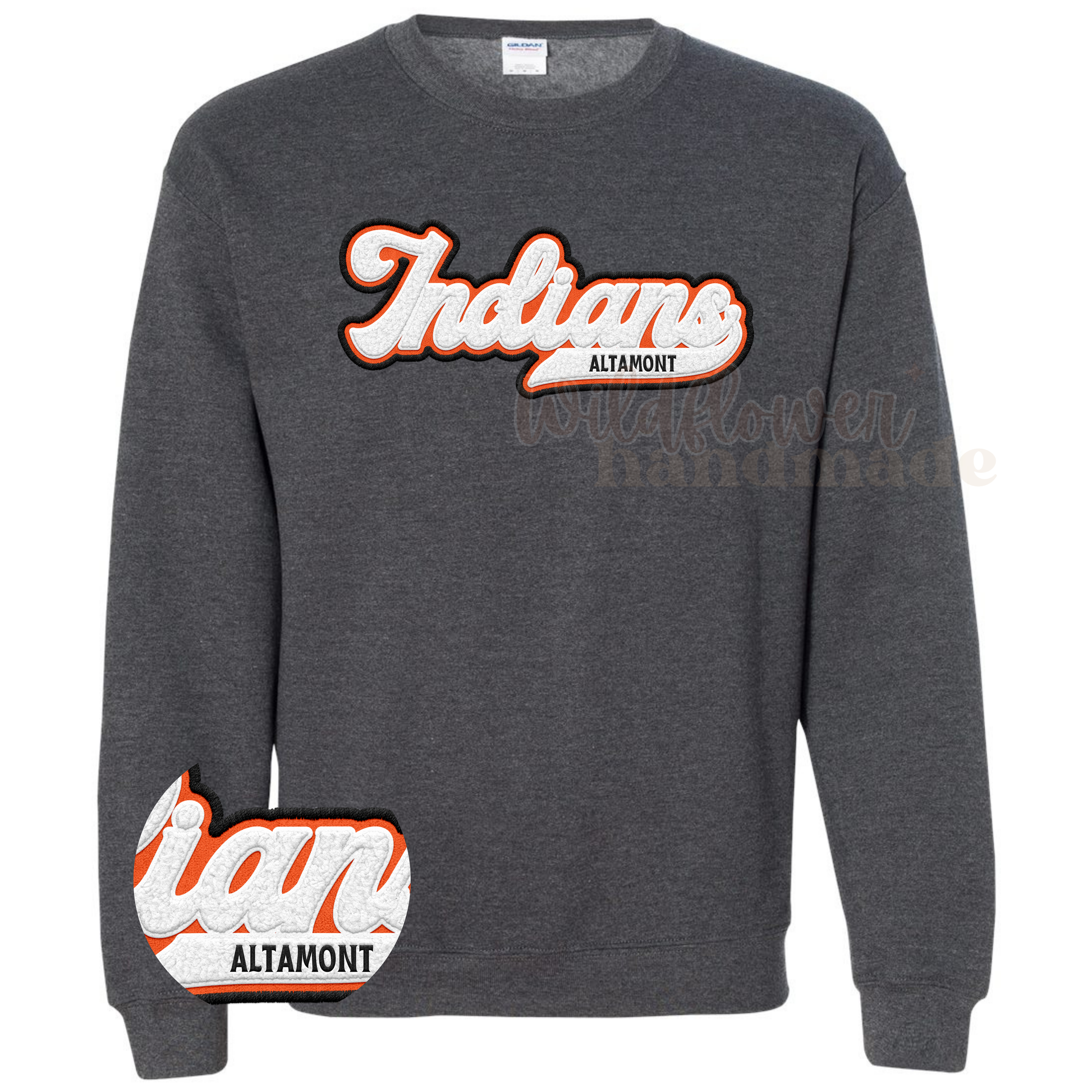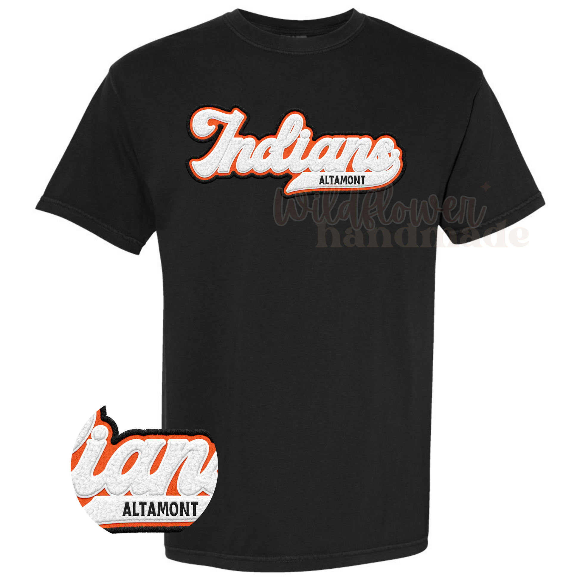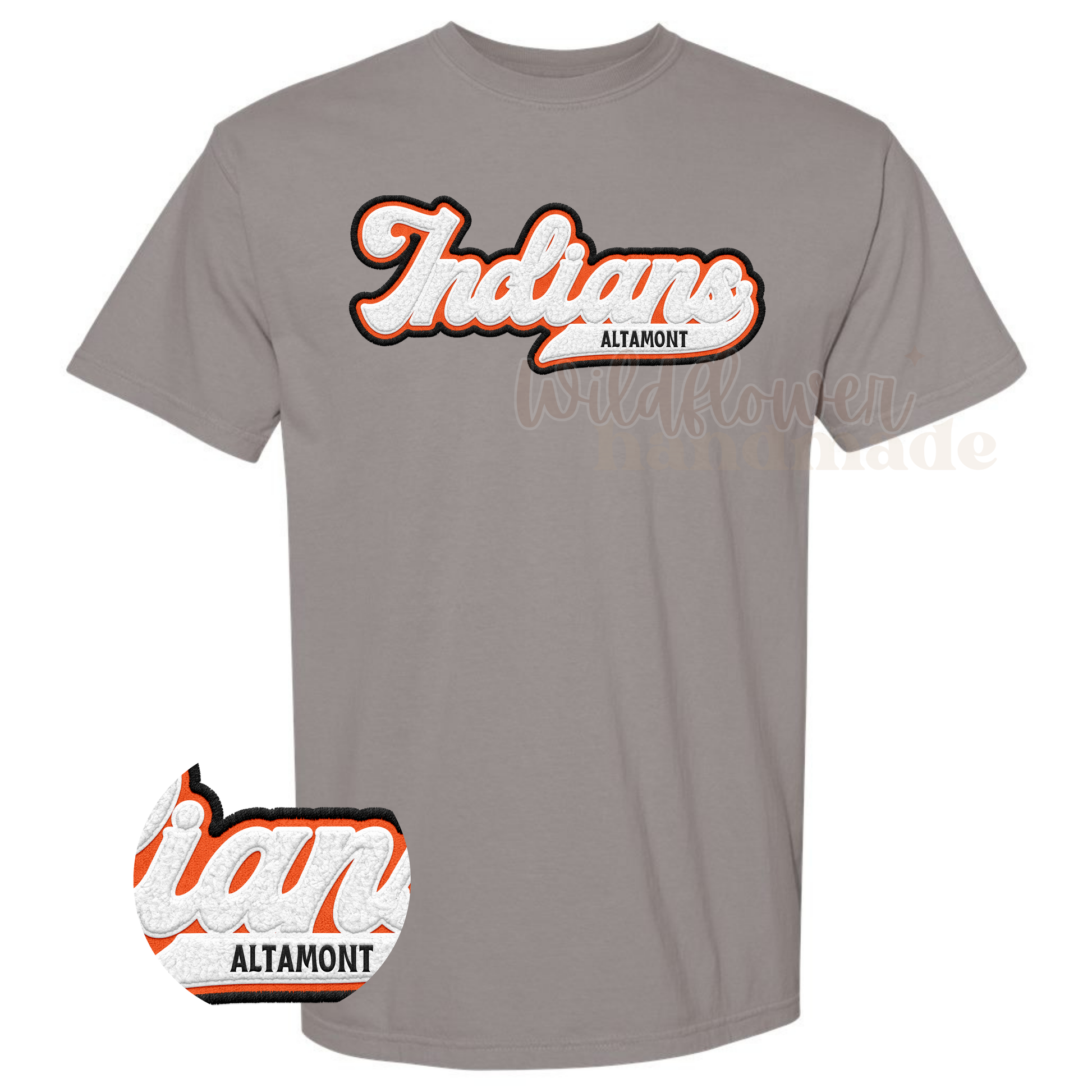 Available in orange, black or grey - *Please note: design is FAUX chenille and is screen printed flat against the shirt*