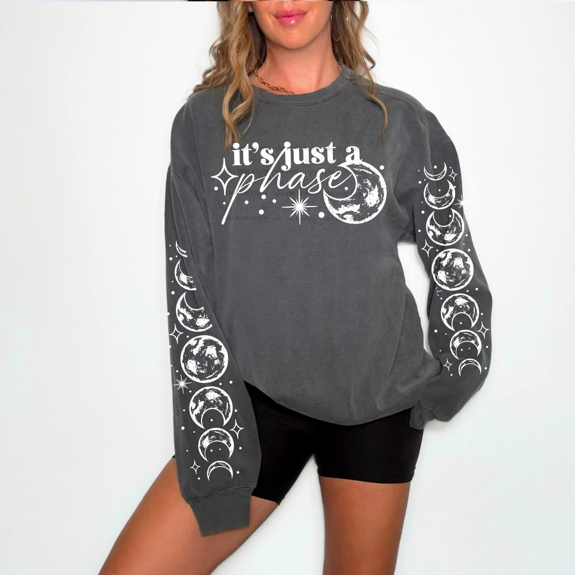 It's Just a Phase with coordinating moon phase sleeve prints. Shown on Comfort Colors Pepper. Crewneck will be Gildan Charcoal