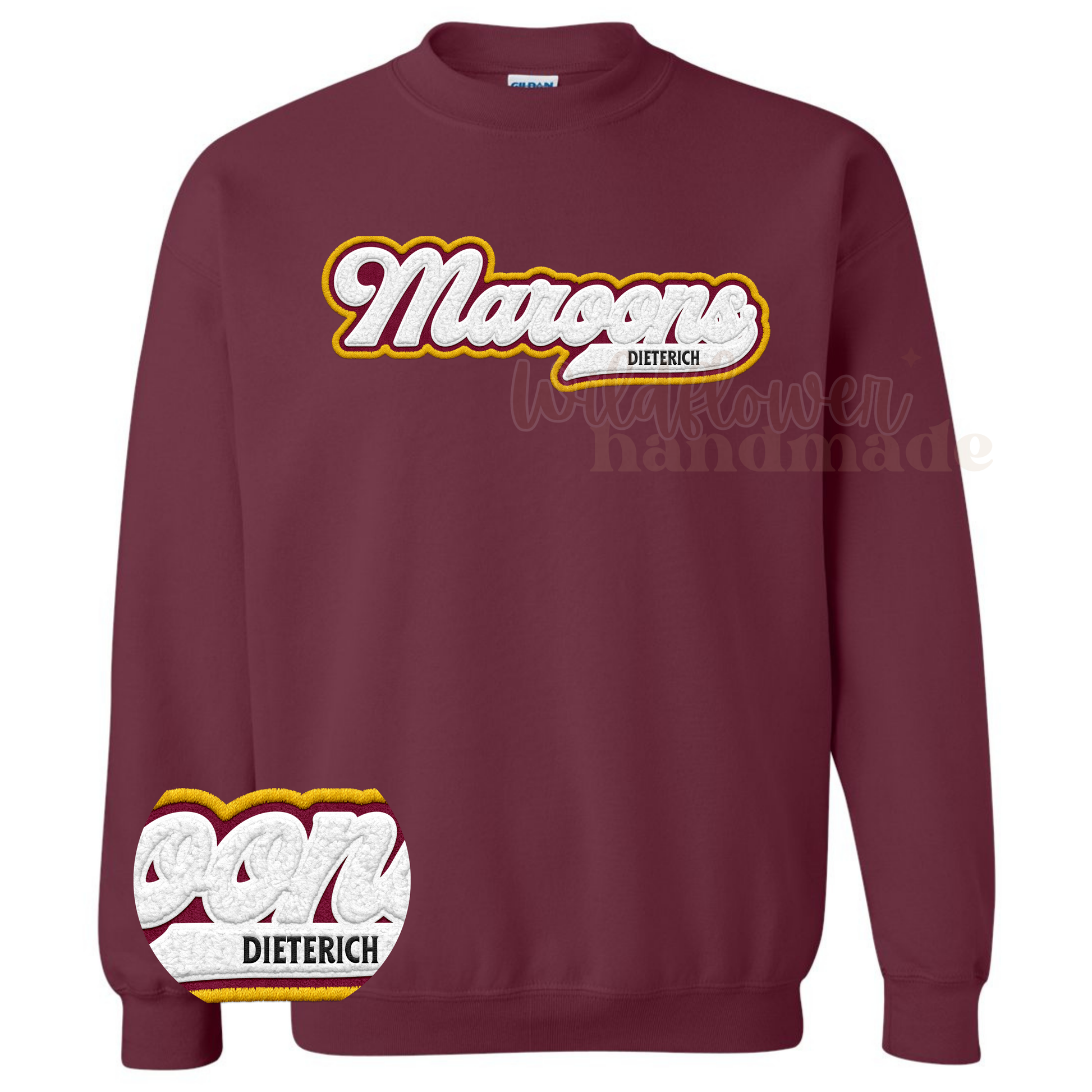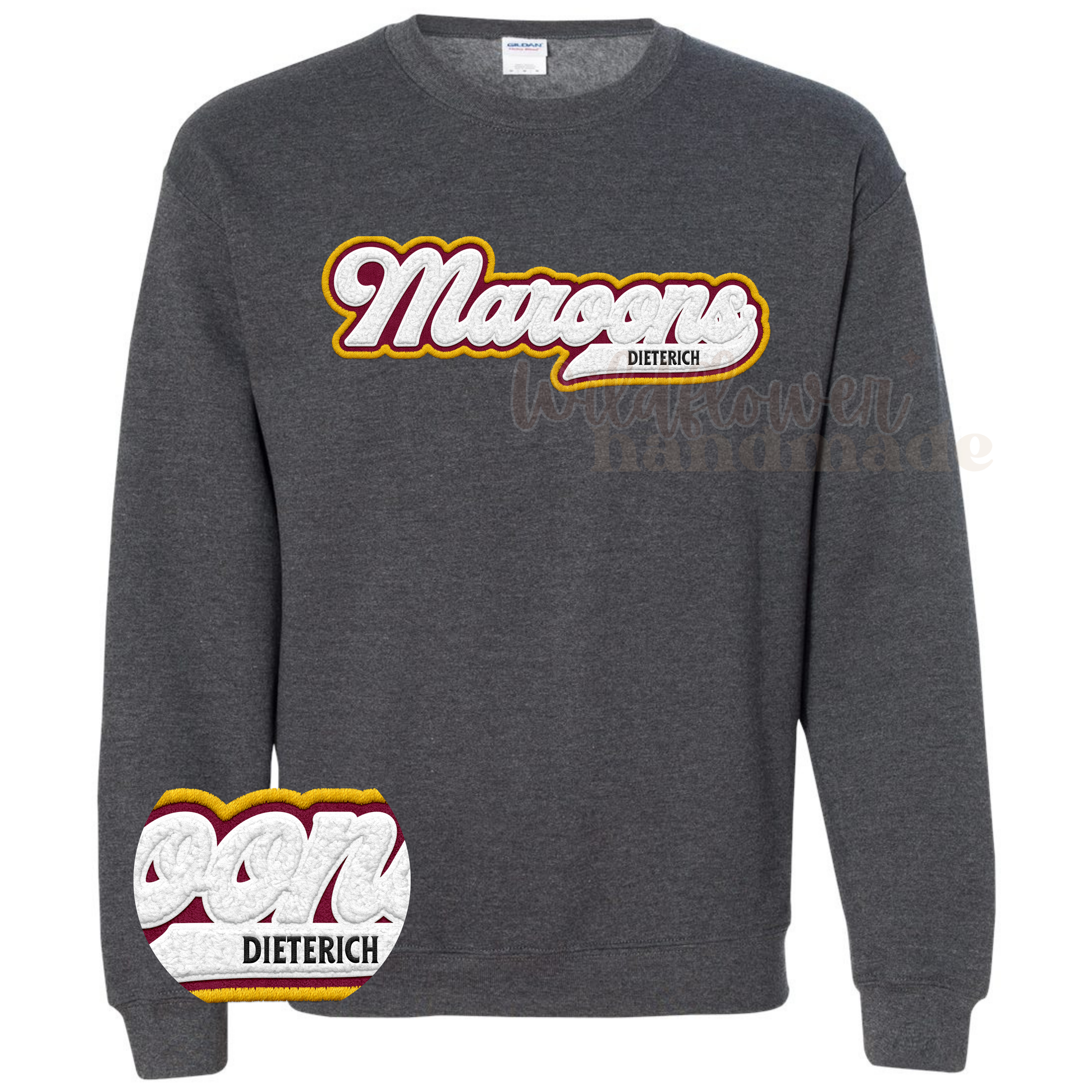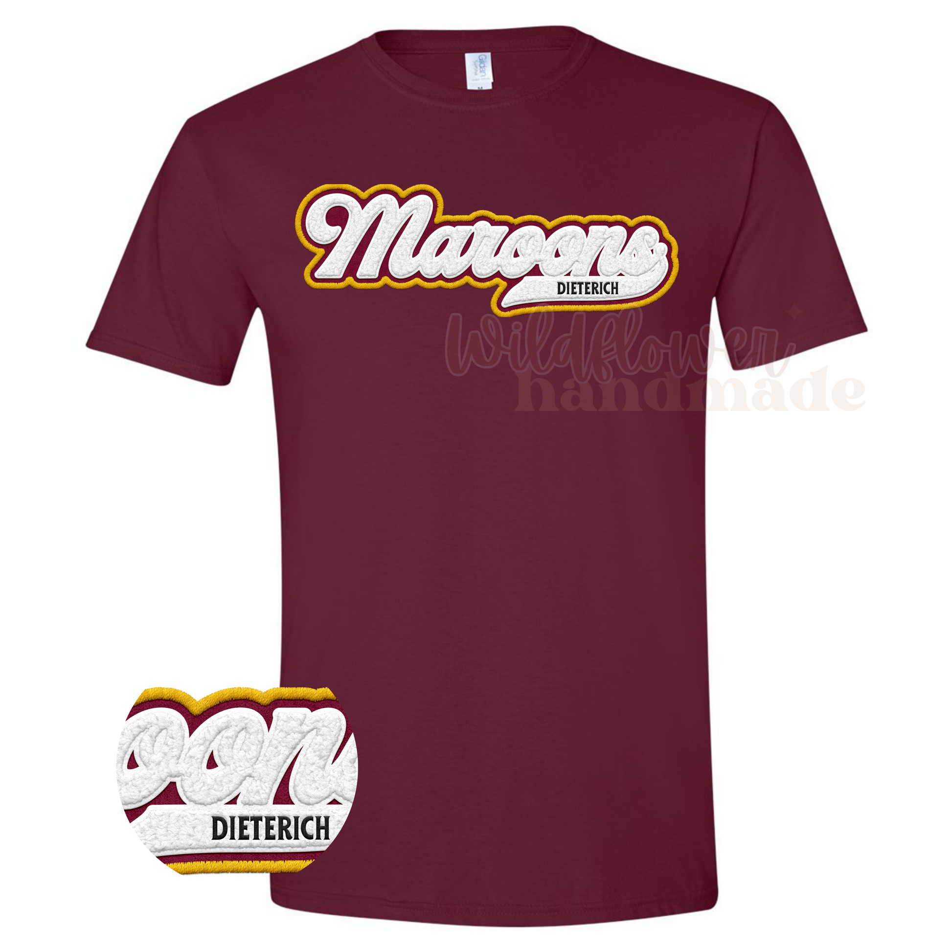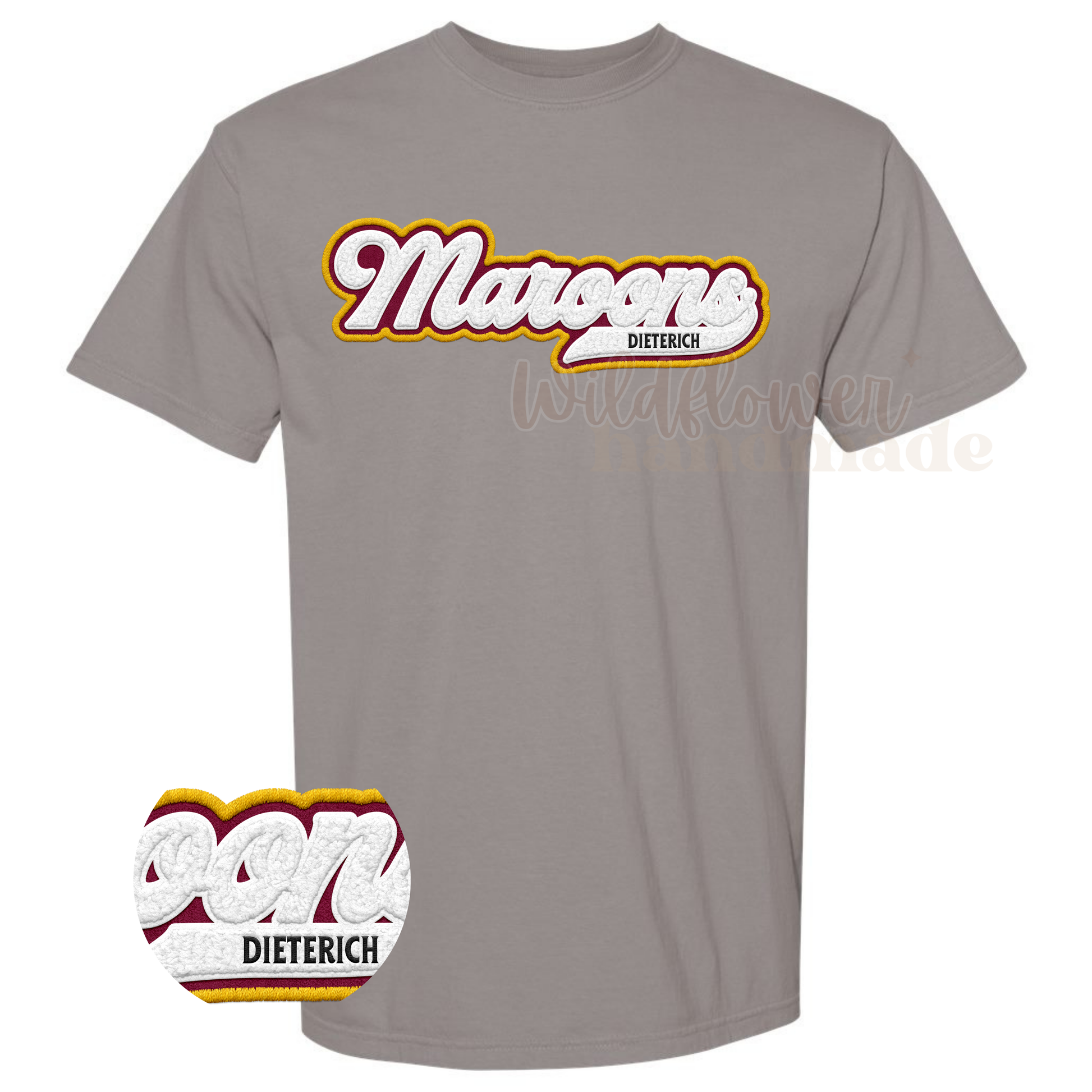 Available in maroon or grey - *Please note: design is FAUX chenille and is screen printed flat against the shirt*