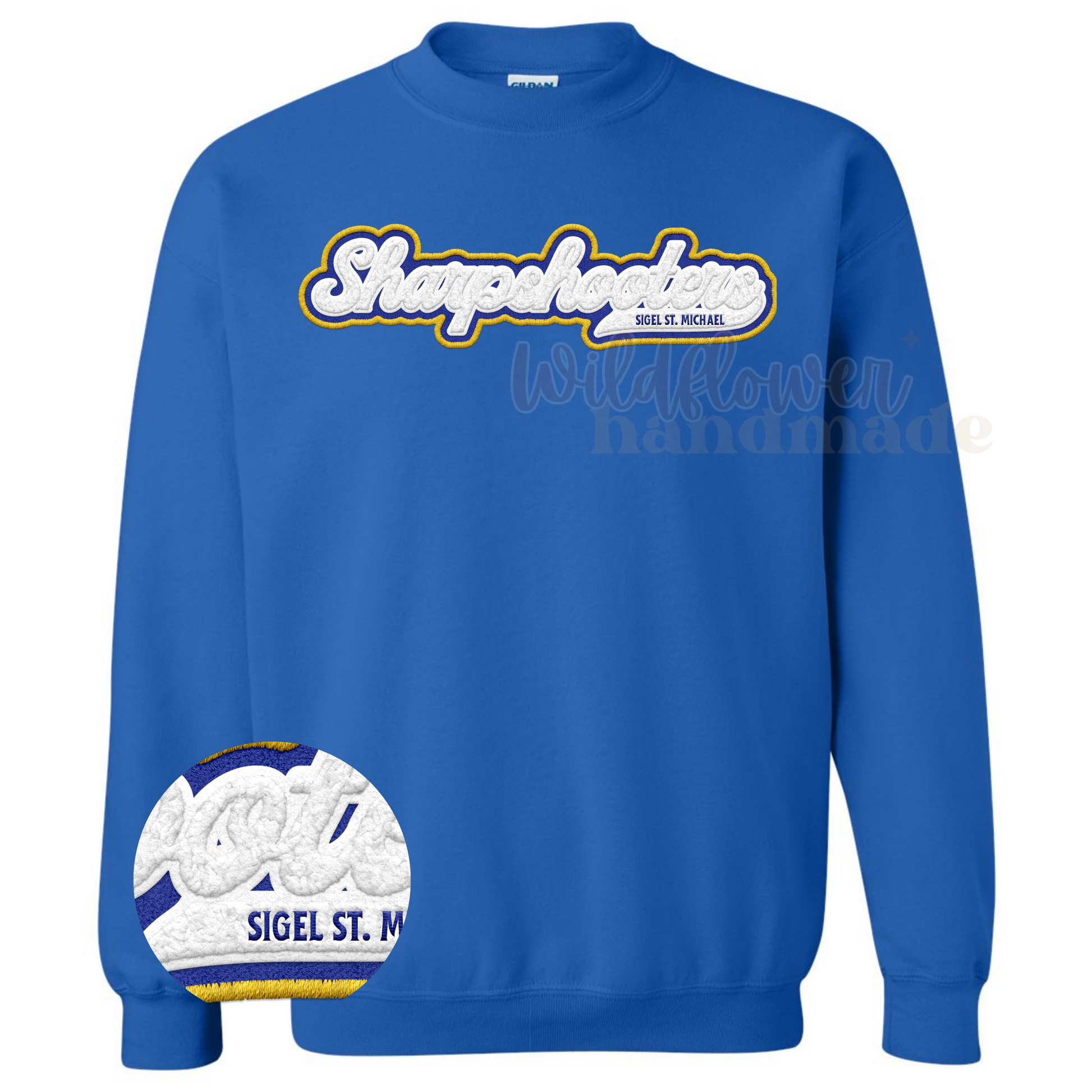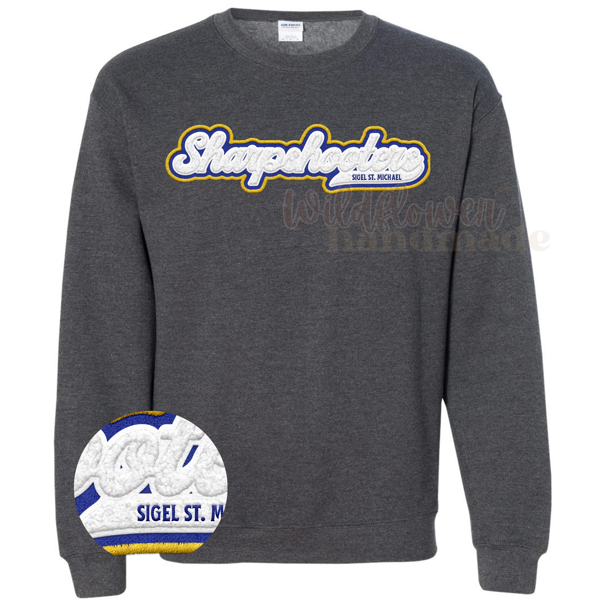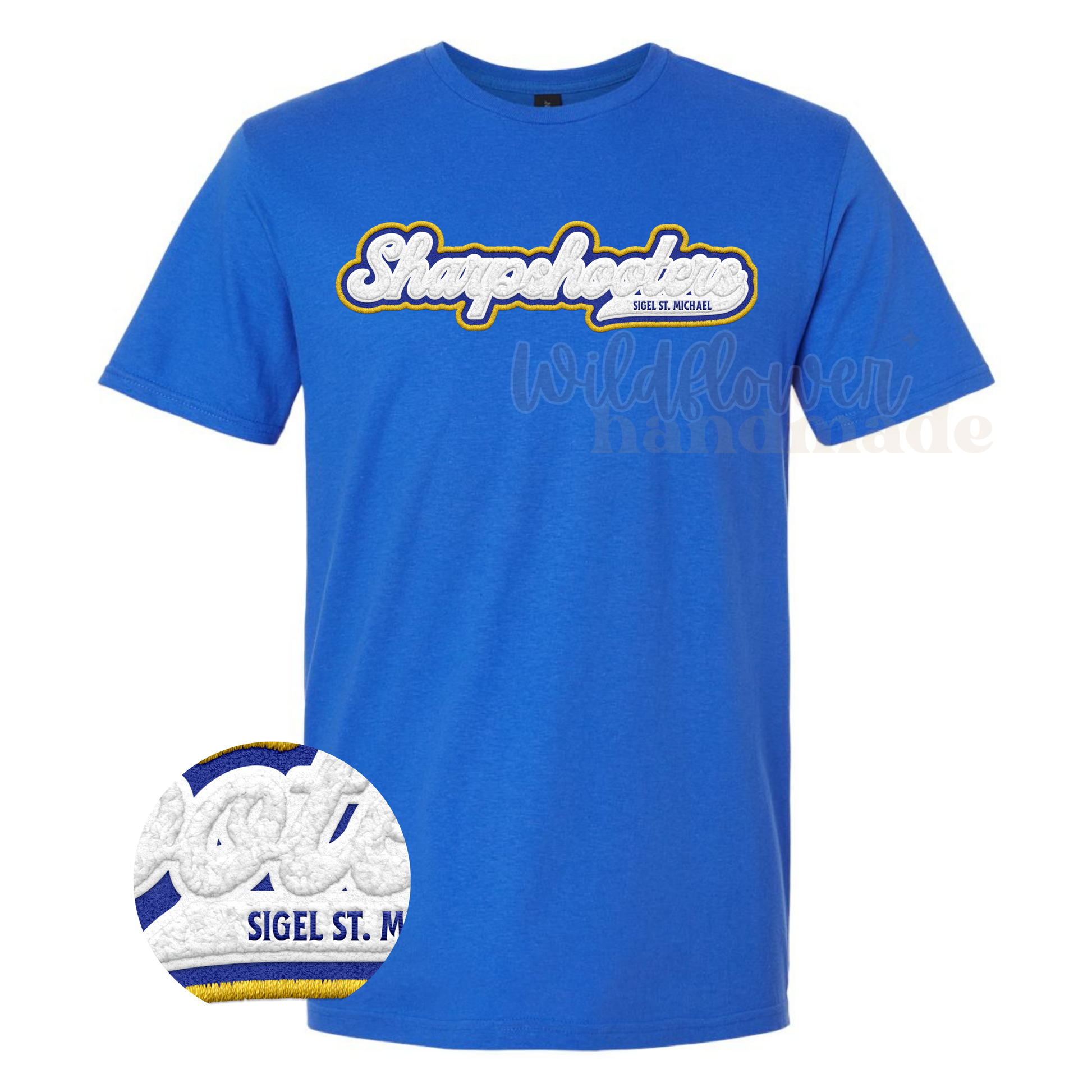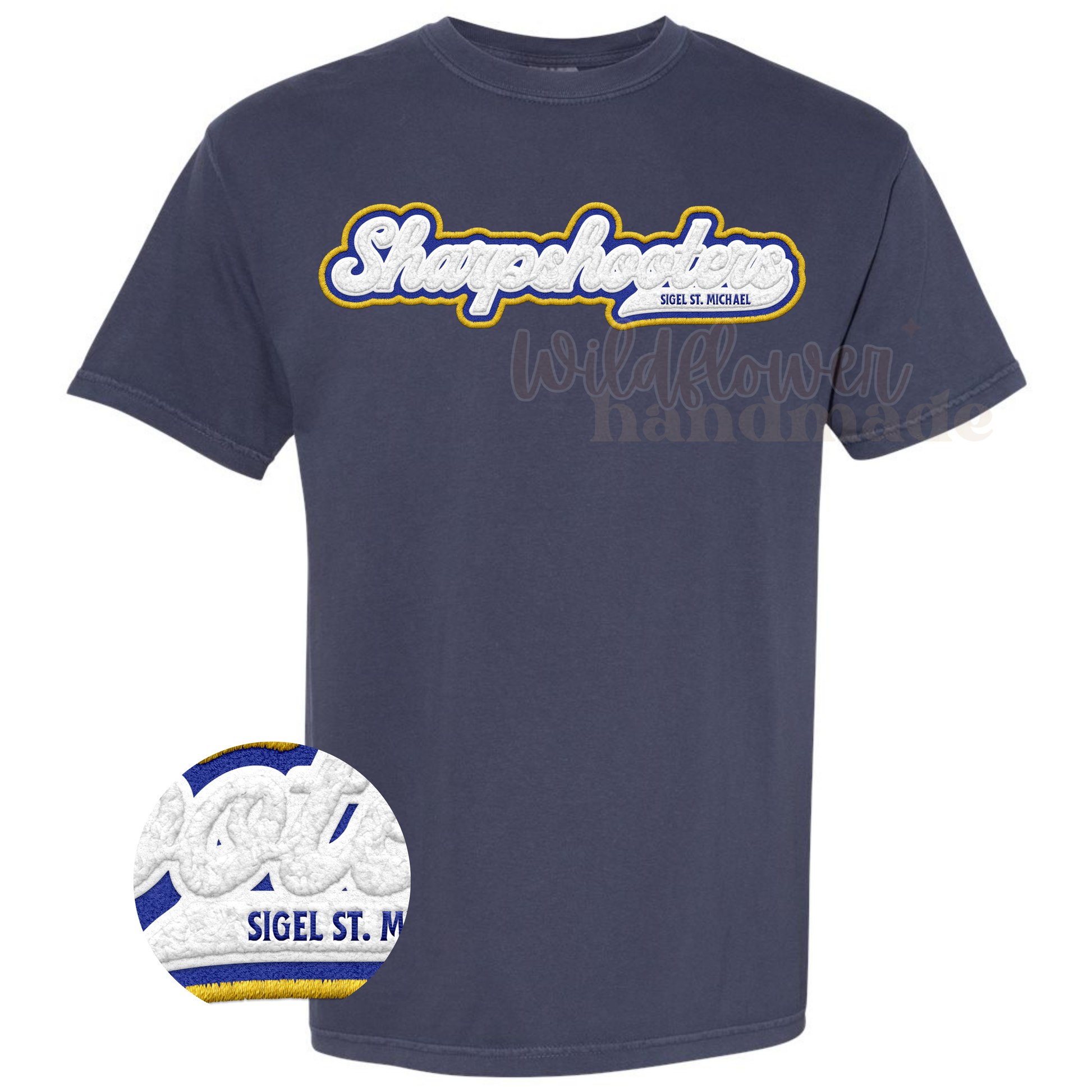 Available in blue or grey - *Please note: design is FAUX chenille and is screen printed flat against the shirt*